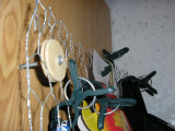 Maschendrahtzaun, etwas versetzt von der Schrankwand angebracht, und Klammern